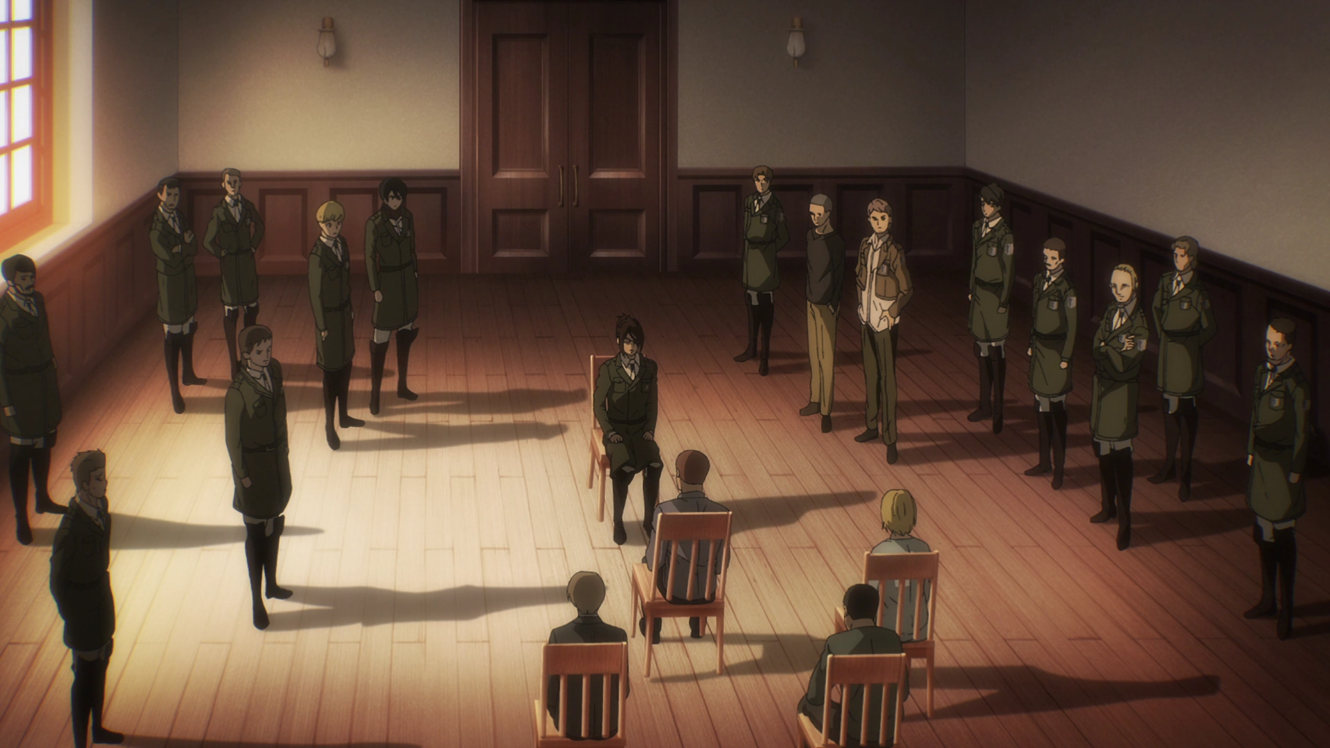 Dans une pièce, l'Escouade tactique, sans Eren et Livaï, et d'autres soldats surveillent les renégats qui ont suivi Eren. Hansi leur demande pourquoi ils ont révélé des informations confidentielles. Frock Vorster lui répond qu'Eren Jäger mérite d'être libre car il n'a rien fait de mal et qu'il fait tout pour le bien des Eldiens et dans l'objectif du Grand Terrassement. Hansi lui rétorque que pour l'instant, le Grand Terrassement est une légende. Frock lui fait remarquer que cela est dû à la captivité d'Eren et lui demande s'ils ont du temps à perdre. Il réclame la libération d'Eren qui devrait être leur chef selon lui. Hansi réplique que c'est elle qui a suivi le plan de Sieg Jäger et que la responsabilité lui revient. Elle les informe qu'ils vont comparaitre et les fait arrêter. Une fois seule, Hansi se souvient des paroles de Djer Sanes sur le poids des responsabilités car elle n'en peut plus mais refuse de baisser les bras.