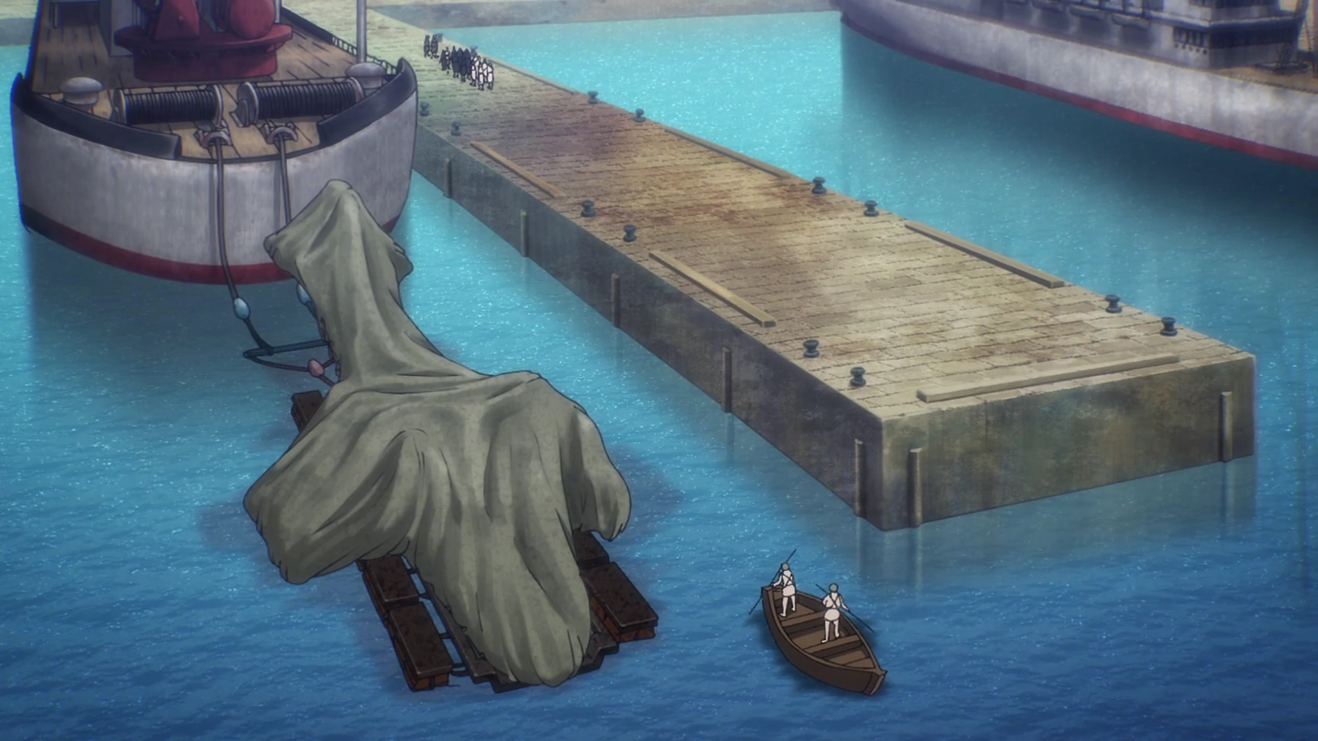Dans une maison, Dot Pixis dit à Jelena qu'à l'inauguration du chemin de fer, dix mois plus tôt, son garde chargé de la surveiller a été remplacé par Frock qui est aux arrêts pour avoir révélé des informations et constate que sa pension de l'époque n'était pas loin de l'adresse d'Eren Jäger, ce qui était parfait pour une entrevue.