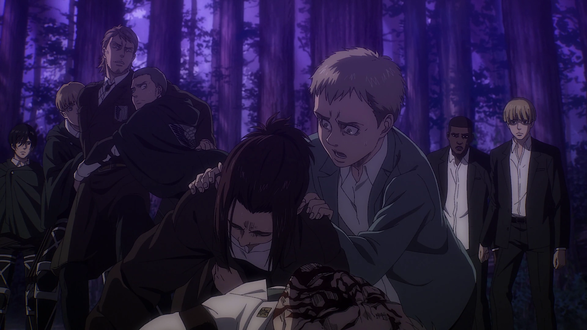 Hansi commence par s'excuser de son absence puis les félicite de s'en être bien tiré. Hansi leur apprend que Livaï est vivant mais dans un mauvais état et qu'ils ont fait alliance avec les survivants de Mahr pour arrêter Eren. Hansi leur laisse la possibilité de refuser mais Mikasa accepte sans l'ombre d'une hésitation contrairement à Jean qui se questionne sur ce qu'il se passera après car les survivants voudront détruire Paradis. Hansi suppose que personne n'attaquera suite au Grand Terrassement mais Jean fait remarquer que cette situation sera pire que le discours de Willy Teyber. Jean rétorque ensuite à Hansi que sa solution est temporaire contrairement à celle d'Eren. Hansi le coupe en lui disant que c'est un acte qu'ils ne peuvent tolérés puis s'excuse d'avoir crié et dit à Jean qu'il a sans doute raison et qu'elle n'a rien à leur dire car elle même voulait arrêter mais qu'elle refuse de laisser le sacrifice de ses amis pour la liberté vain et qu'ils doivent empêcher une nouvelle hécatombe. Jean accepte finalement de la suivre.