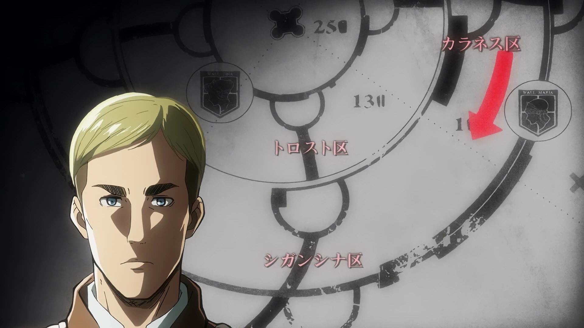 Zackley comprend cette idée, mais demande à Erwin d'où partirait une telle mission, avant de se tourner vers Dot Pixis, lui demandant confirmation sur l'état du mur au District de Trost. Pixis le confirme, notant qu'il n'y a plus aucune possibilité de l'ouvrir un jour.